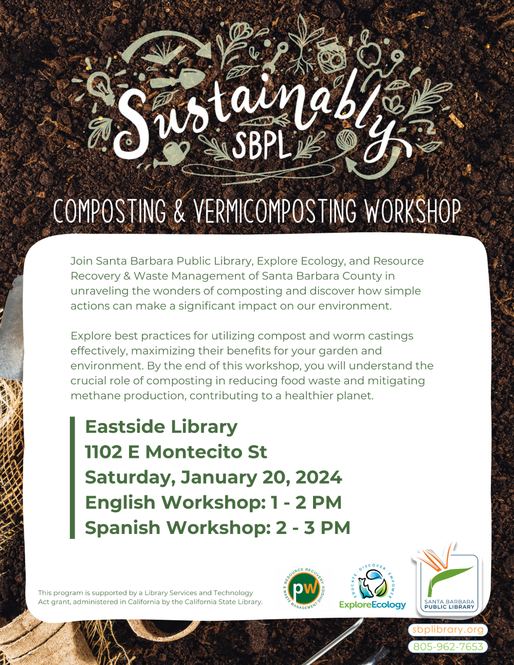 In partnership with Explore Ecology and the Santa Barbara Public Library, the County is excited to announce a composting workshop coming up on Saturday, January 20 at the Eastside Public Library! The Eastside Library is located at 1102 E Montecito St, Santa Barbara, CA 93103. This workshop will be held in English from 1-2pm and again in Spanish from 2-3pm.
